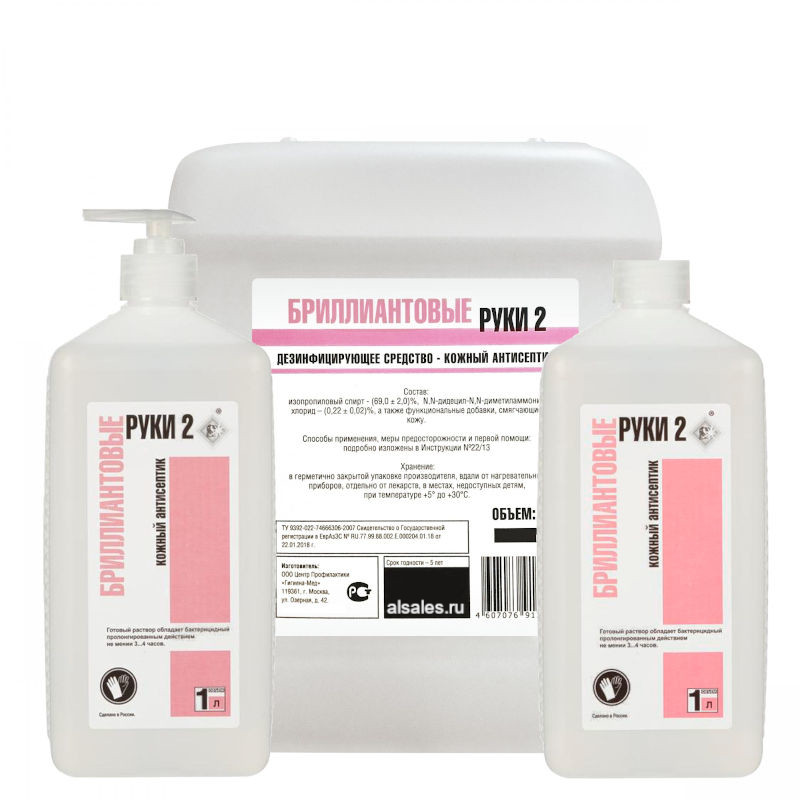 Гигиеническая обработка рук - на кисти рук наносят 3 мл средства (без предварительного мытья рук водой с мылом) и втирают в кожу обеих кистей рук до полного высыхания, но не менее 30 секунд. При сильном загрязнении рук биологическими жидкостями, в том числе кровью, загрязнения удаляют тампоном или салфеткой смоченными средством «Бриллиантовые руки 2». Затем на кисти рук наносят 3 мл средства и втирают в кожу обеих кистей рук до полного высыхания, но не менее 30 секунд. После чего руки моют проточной водой с мылом.