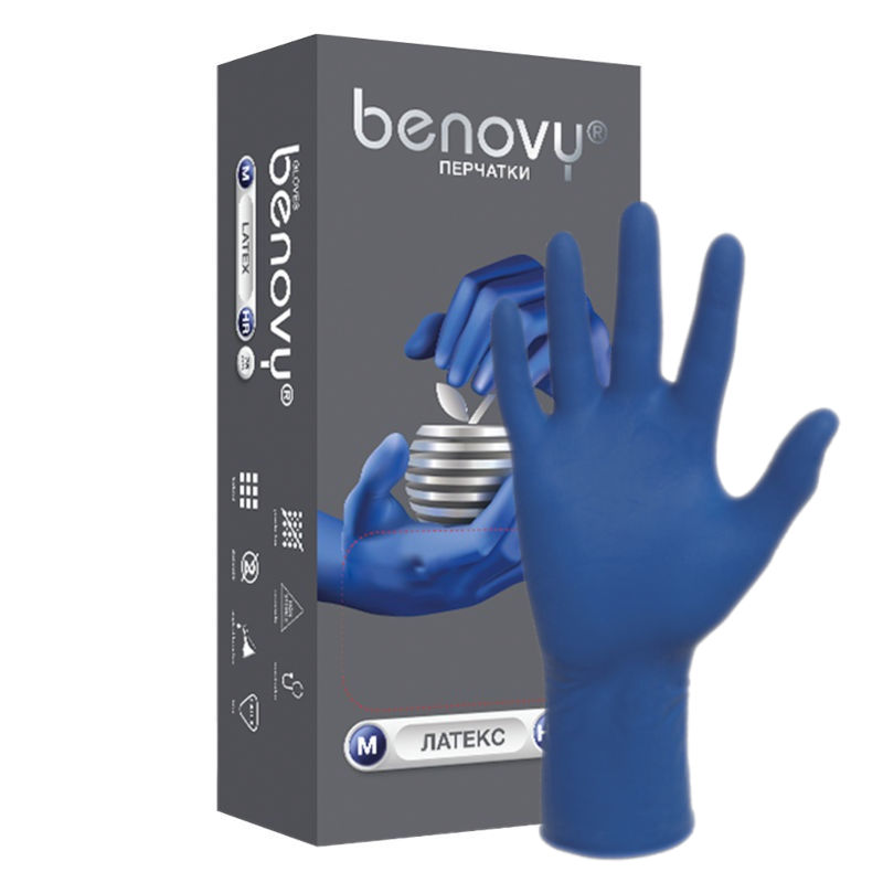 Перчатки медицинские диагностические (смотровые) одноразовые нестерильные BENOVY из натурального латекса текстурированные неопудренные с однократной хлоринацией повышенной прочности синего цвета предназначены для одноразового использования в качестве защитного барьера при ношении на руках медицинского работника во время осмотра/лечения пациента или для других санитарных целей в том числе в паталогоанатомических отделениях, используются в основном как двусторонний барьер для защиты пациента и медперсонала от различных загрязнений. Перчатки повышенной прочности отличаются увеличенной толщиной стенок, текстурированной поверхностью и повышенным сопротивлением к повреждению. Используются в условиях высокого инфекционного риска (риска заражения) во время процедур, при которых существует опасность механического повреждения перчаток, и требуется надежная защита рук. Изготовлены из натурального каучукового латекса с текстурированной рабочей поверхностью, а внутренняя поверхность обработана с помощью однократного хлорирования. Текстурированная рабочая поверхность обеспечивает более лучшее удержание инструмента в руке. Форма перчатки - плоская, неанатомическая, без разделения на правую и левую руку. Наличие валика, скрученного вовнутрь, препятствует скатыванию перчатки и обеспечивает комфорт при работе с пациентами.