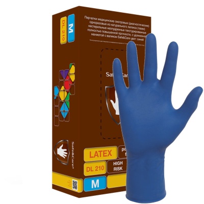 Перчатки медицинские диагностические (смотровые) одноразовые нестерильные Safe&Care DL210 High Risk из натурального латекса текстурированные неопудренные с двукратное хлорирование повышенной прочности синего цвета предназначены для одноразового использования в качестве защитного барьера при ношении на руках медицинского работника во время осмотра/лечения пациента или для других санитарных целей в том числе в паталогоанатомических отделениях, используются в основном как двусторонний барьер для защиты пациента и медперсонала от различных загрязнений. Перчатки повышенной прочности отличаются увеличенной толщиной стенок, текстурированной поверхностью и повышенным сопротивлением к повреждению. Используются в условиях высокого инфекционного риска (риска заражения) во время процедур, при которых существует опасность механического повреждения перчаток, и требуется надежная защита рук. Изготовлены из натурального каучукового латекса с текстурированной рабочей поверхностью, а внутренняя поверхность обработана с помощью двукратное хлорирование. Текстурированная рабочая поверхность обеспечивает более лучшее удержание инструмента в руке. Форма перчатки - плоская, неанатомическая, без разделения на правую и левую руку. Наличие валика, скрученного вовнутрь, препятствует скатыванию перчатки и обеспечивает комфорт при работе с пациентами.