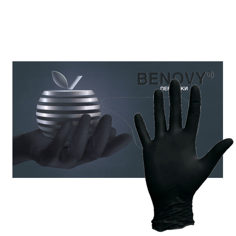 Перчатки нитриловые черные Benovy, вес – 7 грамм/пара – плотные и эластичные. Текстурированные на пальцах и гладкие на ладони. Неопудренная внутренняя поверхность. Смотровые перчатки имеют разрешение на использование в медицинской деятельности. Черные перчатки так же используются в барбершопах, тату-мастерских, бургерных, химических лабораториях и салонах красоты (шугаринг, ногтевой сервис, окраска волос). Состав перчаток не содержит протеинов латекса натурального каучука и тем самым не вызывает аллергии. Искусственнный нитриловый состав перчаток позволяет применять черные нитриловые перчатки при контакте с широким спектром химических соединений.