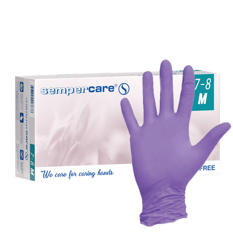 Перчатки из искуственного нитрила Sempercare LN 303 . Вес – 6 грамм/пара. Плотность нитрильной пленки позволяет использовать перчатки в большинстве случаев, когда необходима защита рук. Применяются для работы в различных лечебных учреждениях: стоматологиях, стационарах, при проведении осмотров и заборе крови. Так же часто используются в бьюти-салонах и парикмахерских при косметических процедурах и окраске волос. Состав перчаток не содержит протеинов латекса натурального каучука и не вызывает аллергических реакций. Искусственнный нитриловый состав перчаток позволяет применять нитриловые перчатки при контакте с широким спектром химических соединений. В упаковке 100 пар (для размеров XS,S,M,L); 90 пар (для размера XL).
